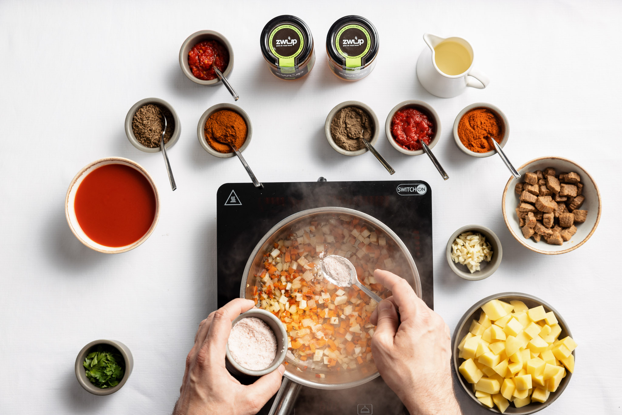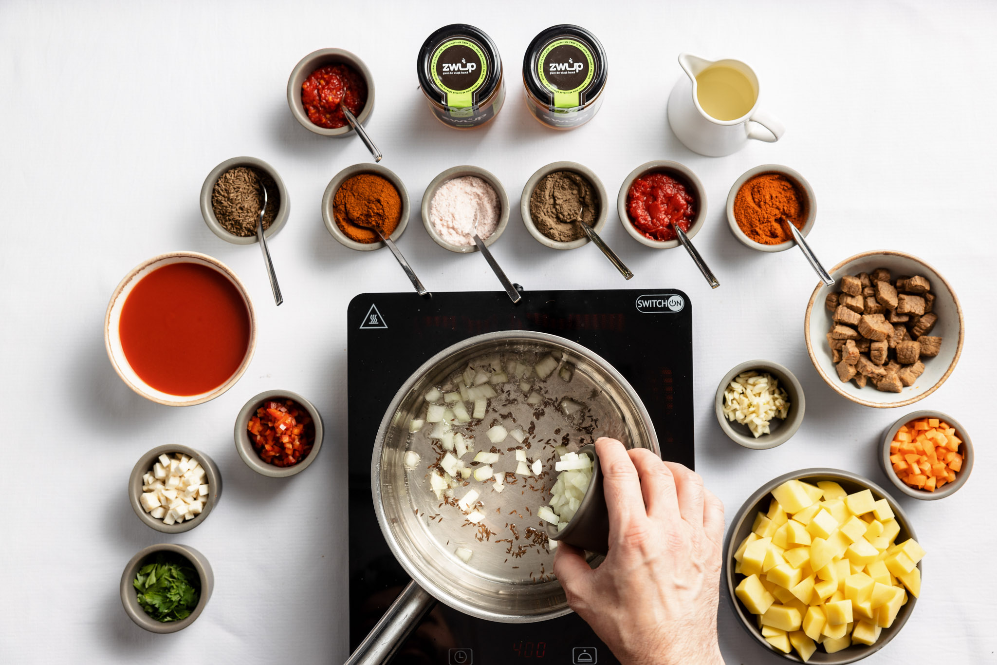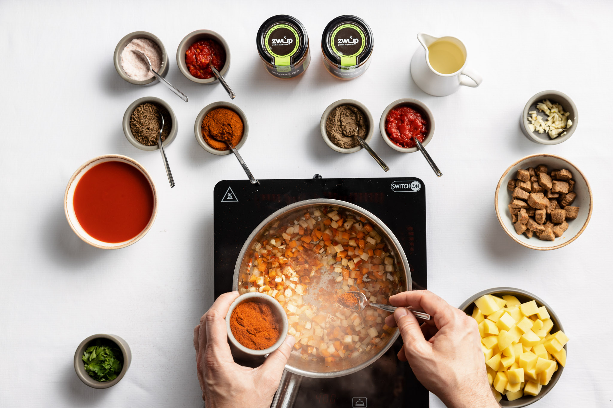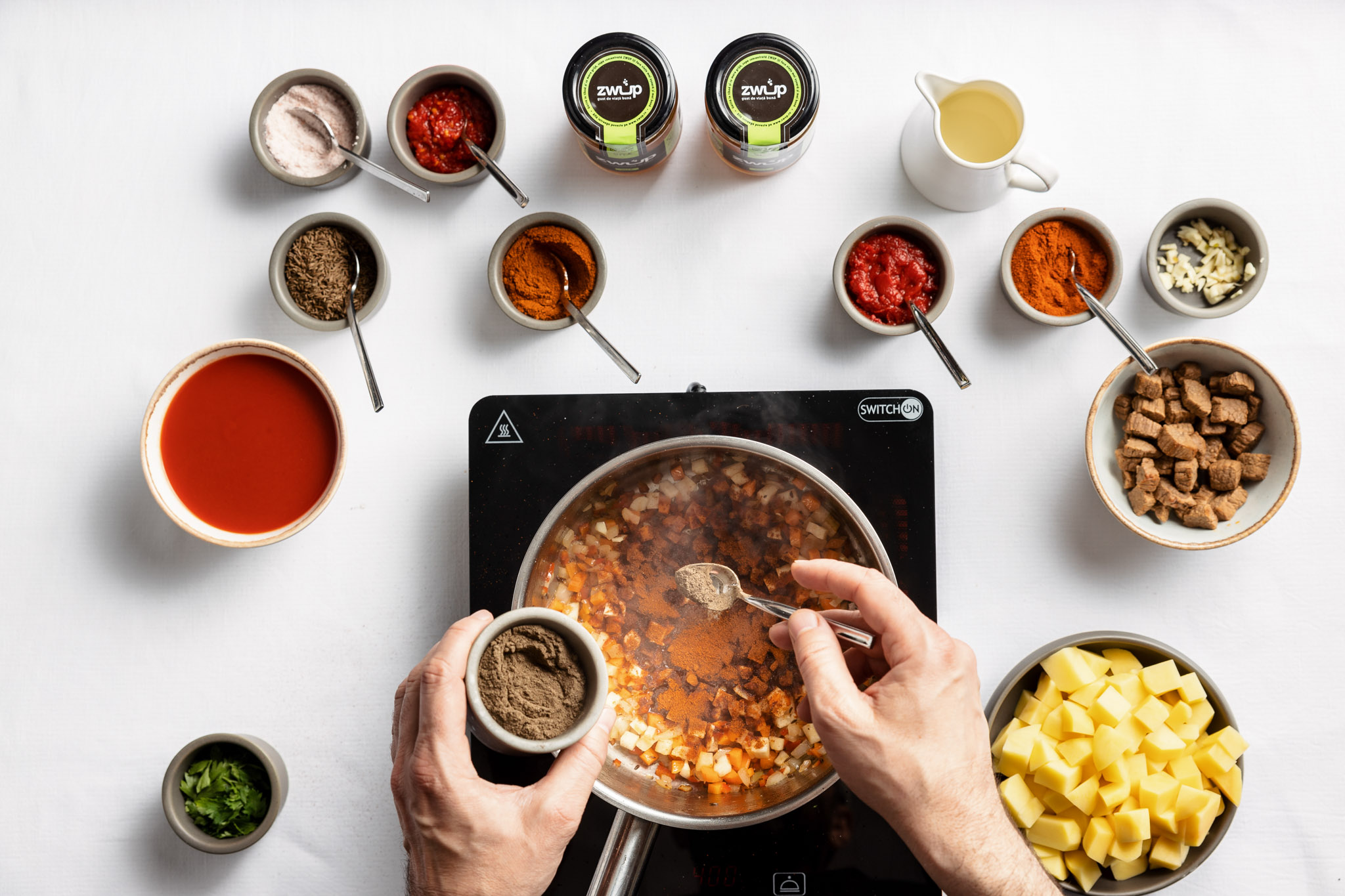 Gulașul de vită e o mâncare hrănitoare și robustă, picantă cât să îți dea chef de viață și de o tărie aromată, potrivită pentru zile reci și oameni flămânzi, și întotdeauna perfectă pentru pregătit la ceaun în aer liber, la un foc de tabără ori lângă o cabană de munte. Dacă circumstanțele nu sunt prielnice gătitului îndelungat și răbdător, ZWUP îți permite să obții rapid și simplu un gulaș delicios, cu carne de vită gata fiartă, pregătită din timp sau rămasă de la alt preparat.