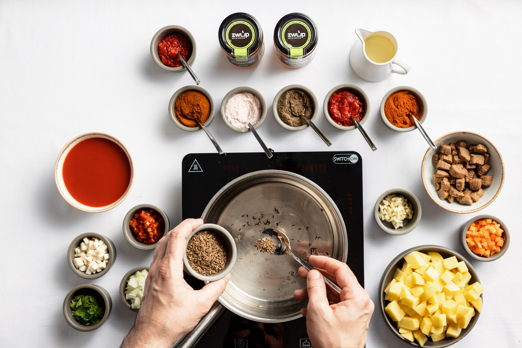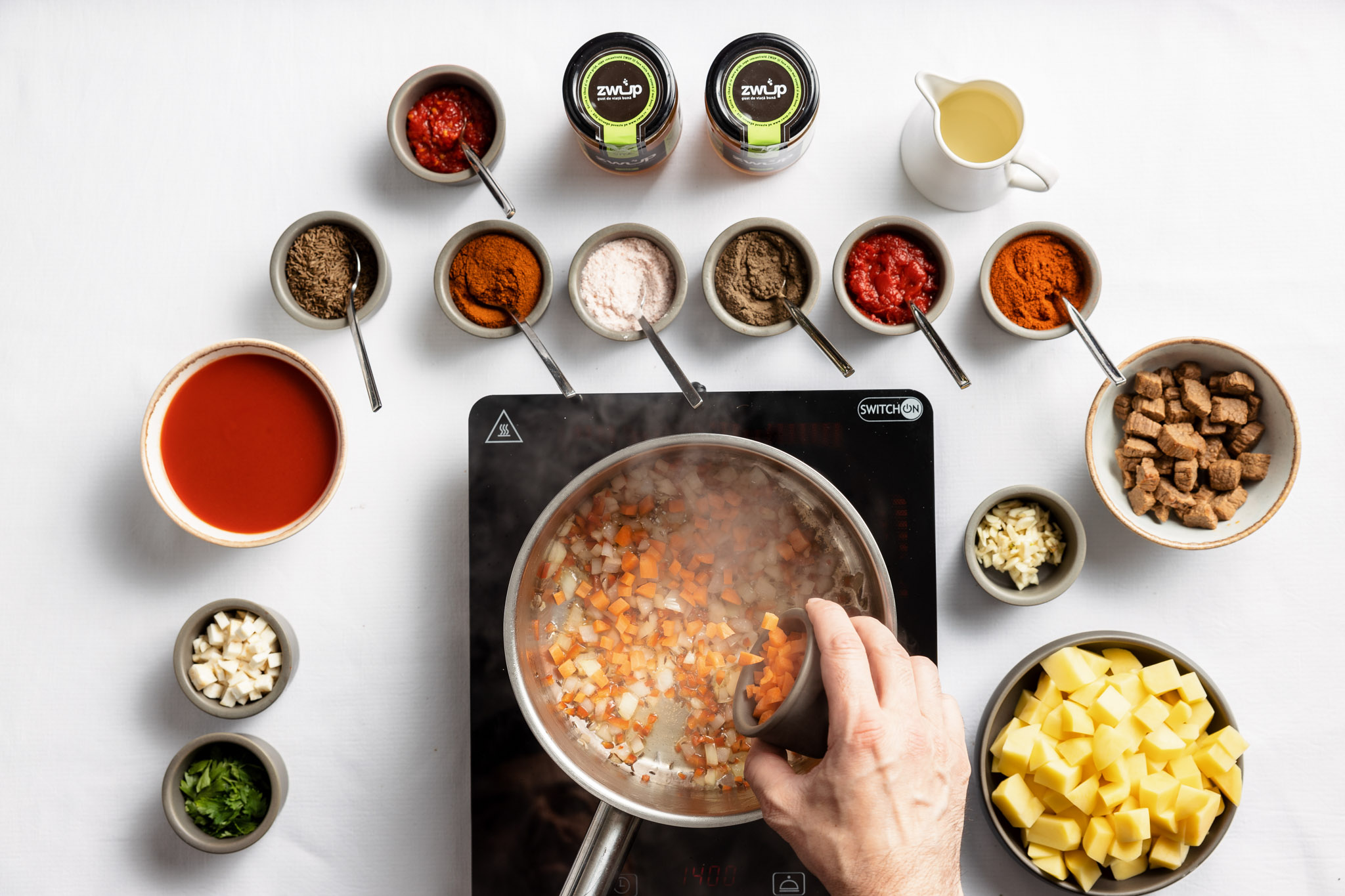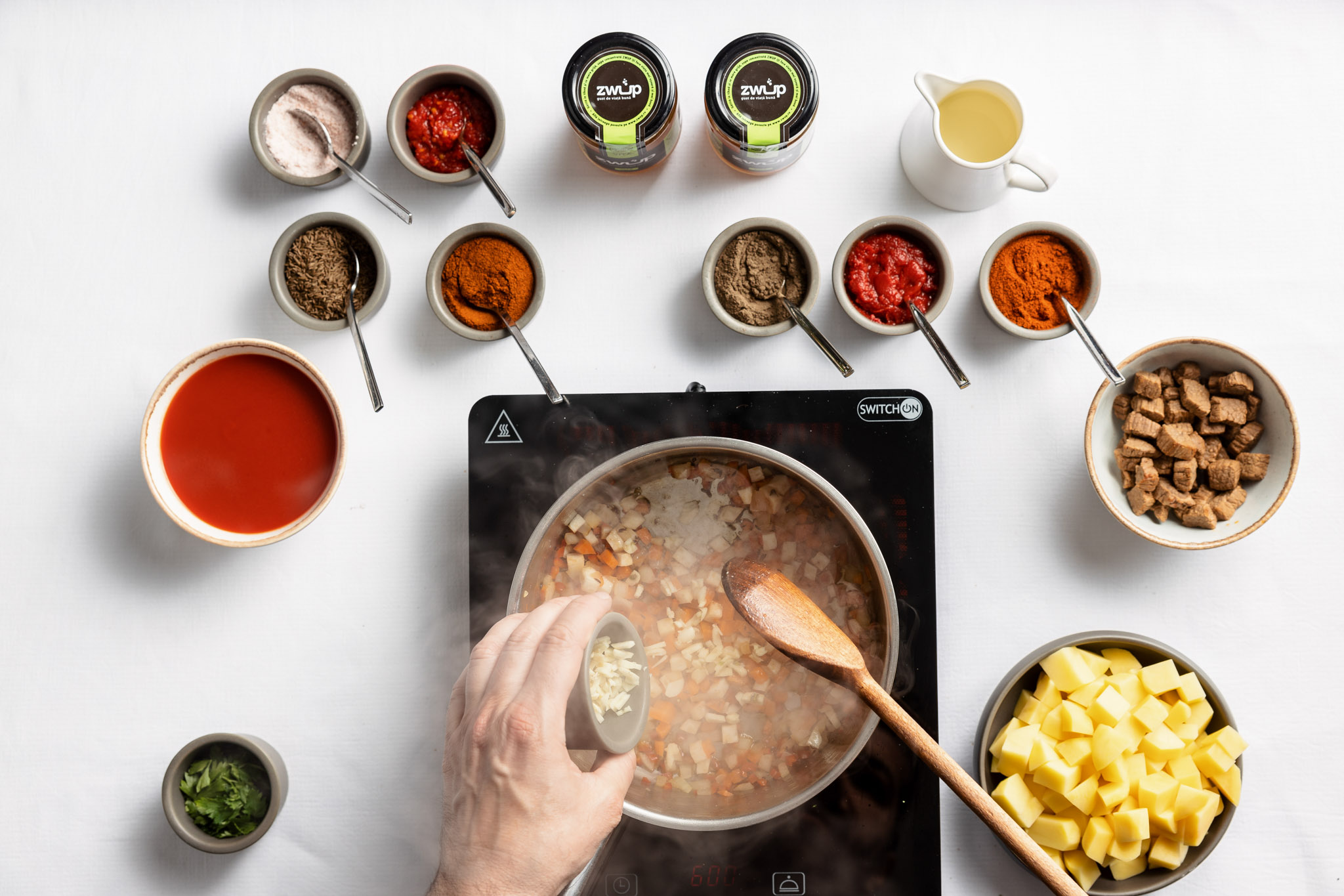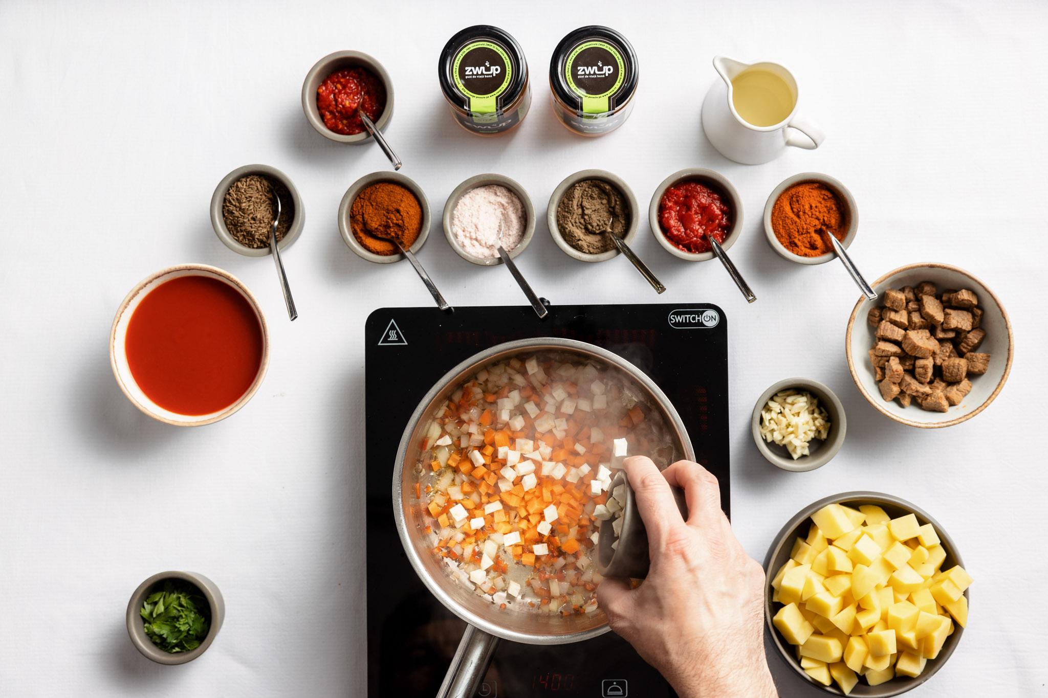 Gulașul de vită e o mâncare hrănitoare și robustă, picantă cât să îți dea chef de viață și de o tărie aromată, potrivită pentru zile reci și oameni flămânzi, și întotdeauna perfectă pentru pregătit la ceaun în aer liber, la un foc de tabără ori lângă o cabană de munte. Dacă circumstanțele nu sunt prielnice gătitului îndelungat și răbdător, ZWUP îți permite să obții rapid și simplu un gulaș delicios, cu carne de vită gata fiartă, pregătită din timp sau rămasă de la alt preparat.