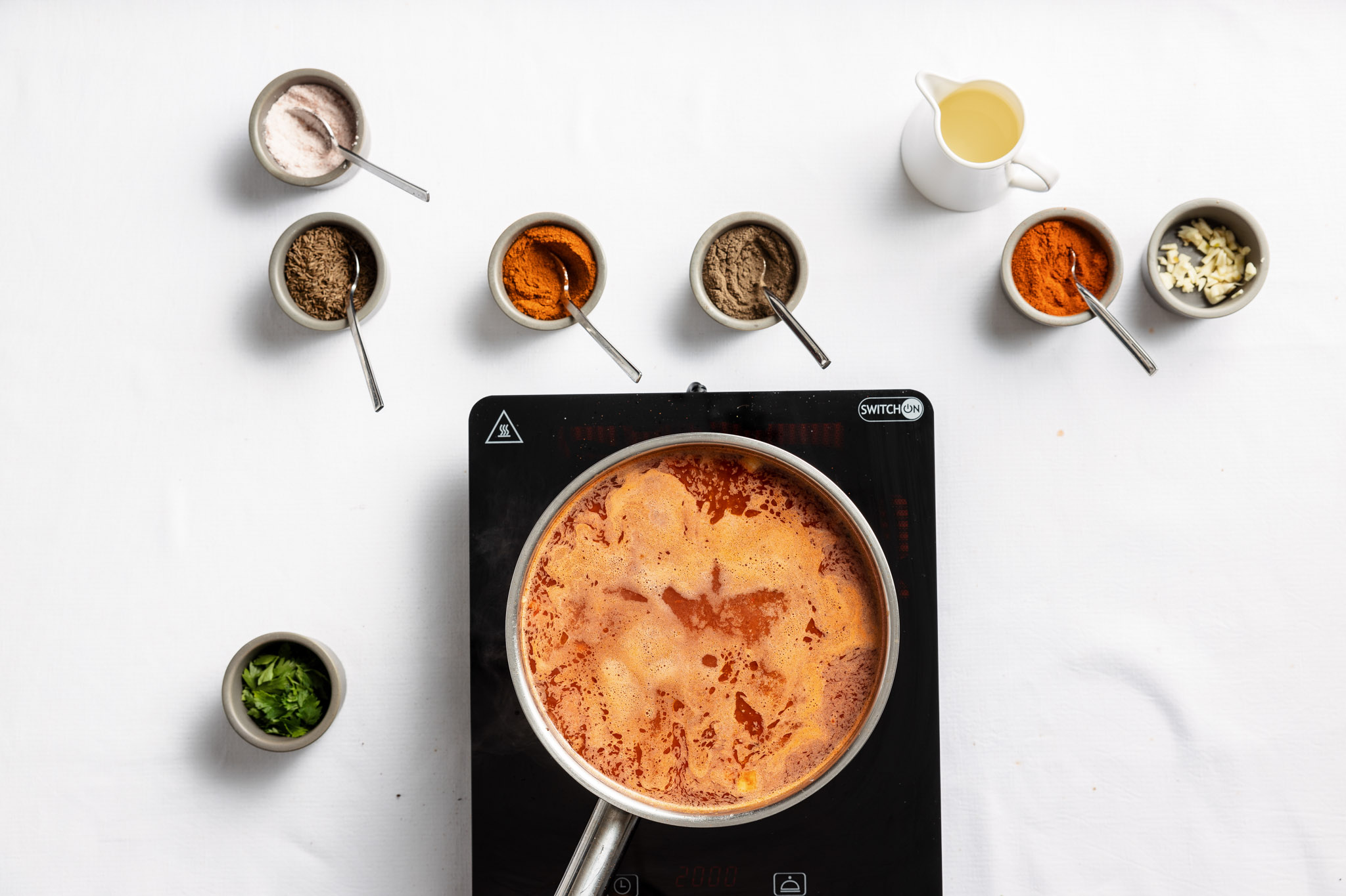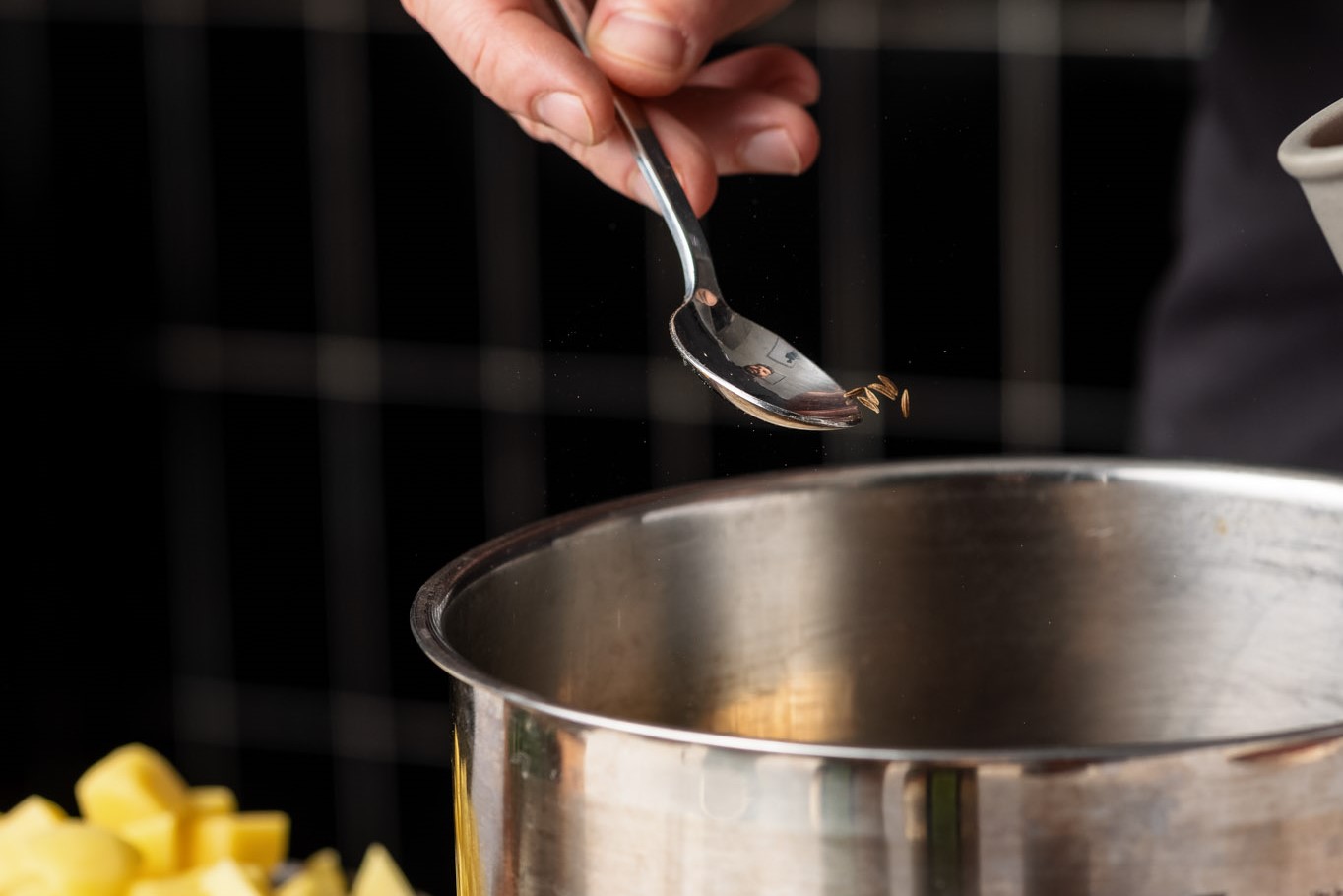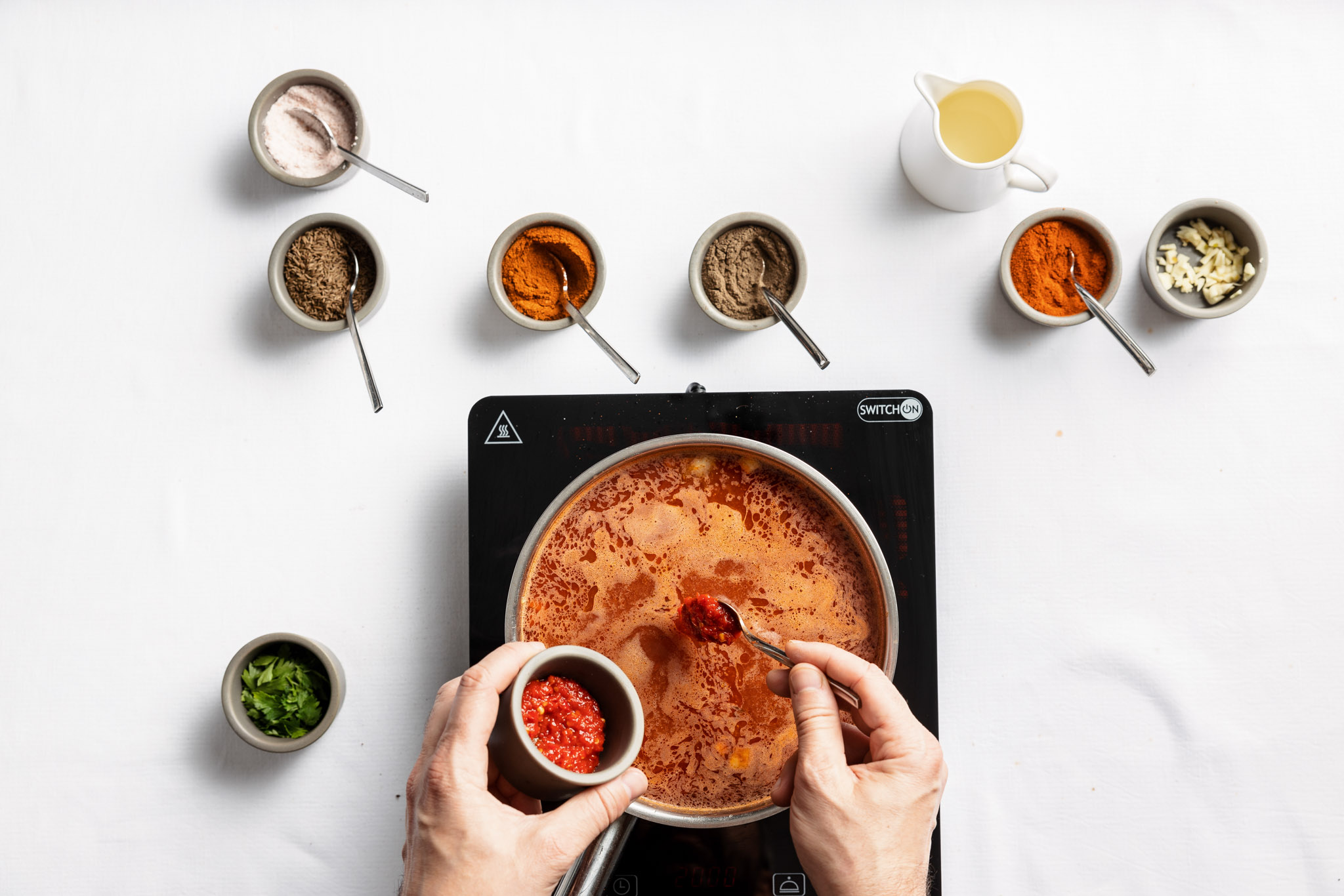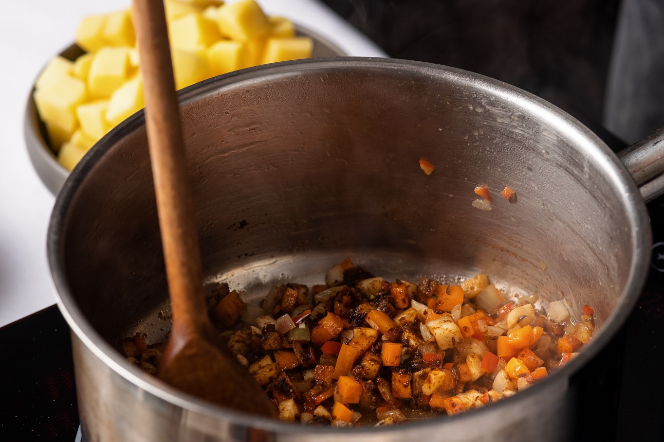 Încălzește puțin ulei într-o oală de mărime potrivită și aruncă în el semințele de chimen, lăsându-le să se încălzească și să emane miros amețitor. Adaugă ceapa și ardeiul capia, apoi morcovul și țelina. Amestecă și lasă legumele să se topească. Asezonează cu sare, piper, usturoi, boia dulce și iute. Amestecă din nou.