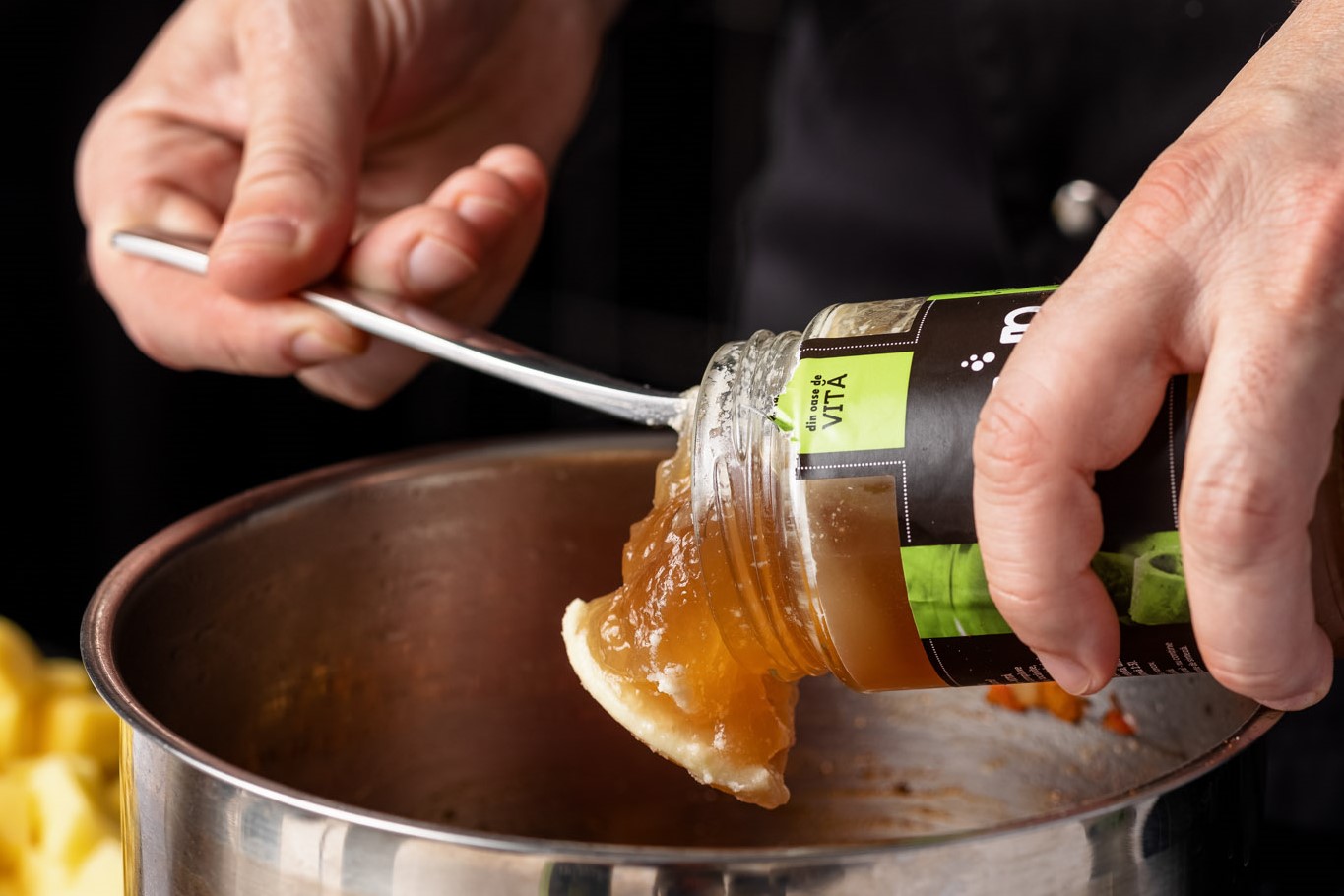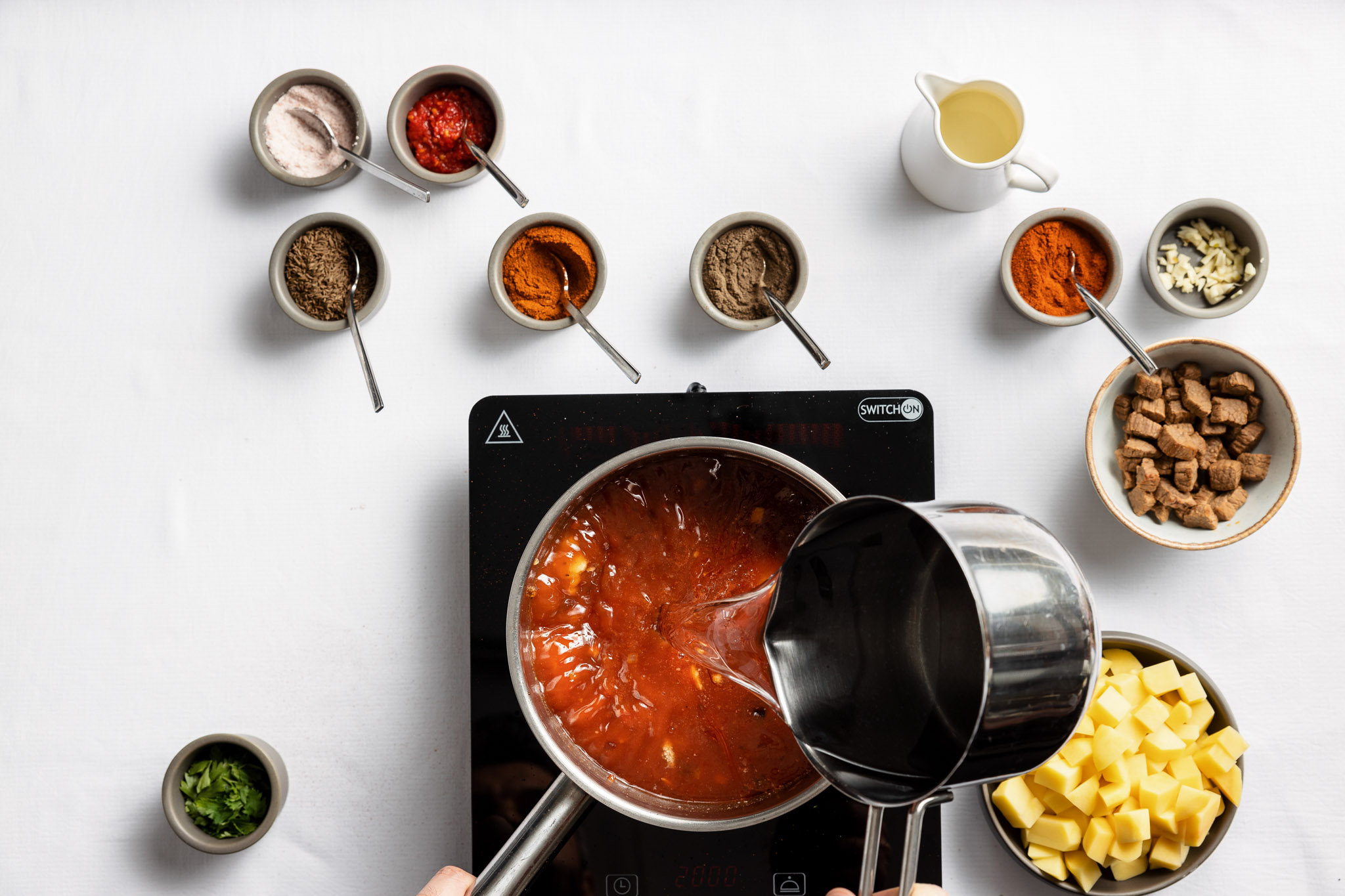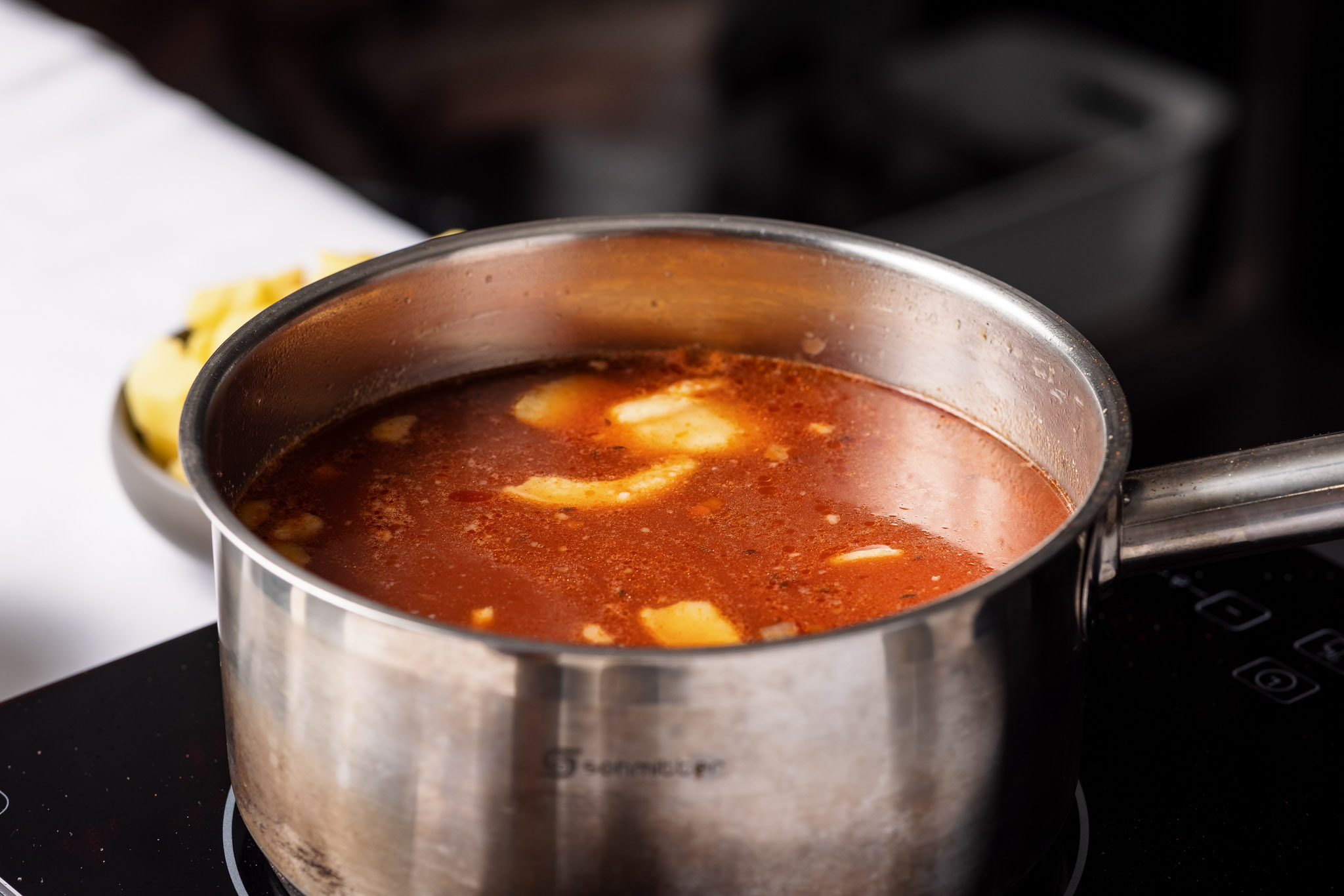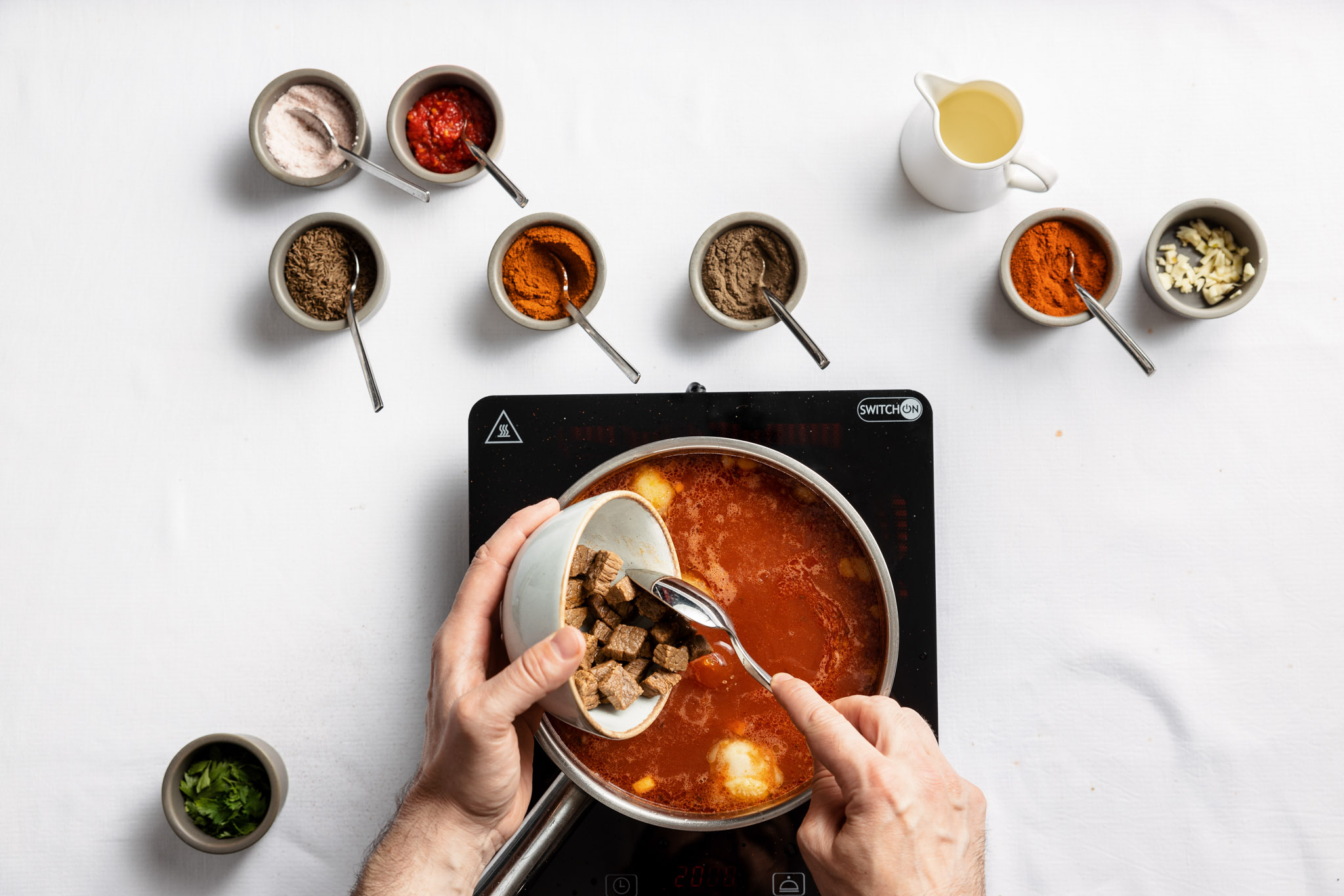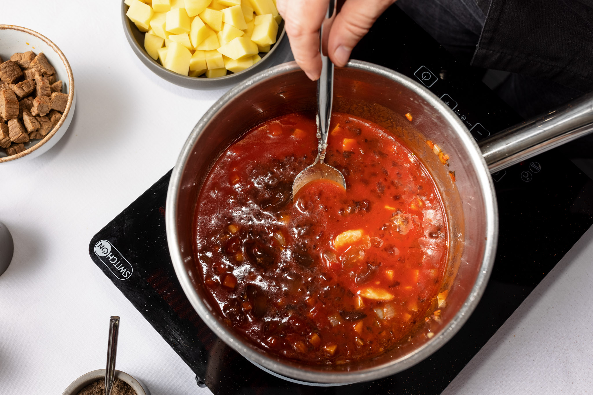 După câteva minute, pune bulionul și sucul de roșii, apoi cele 2 borcane de ZWUP de vită și cei doi litri de apă. Amestecă, apoi adaugă în oală cartofii și carnea de vită fiartă. Lasă totul la fiert la foc potrivit timp de aproximativ 30 minute, cât mâncarea mai scade și aromele se întrepătrund.